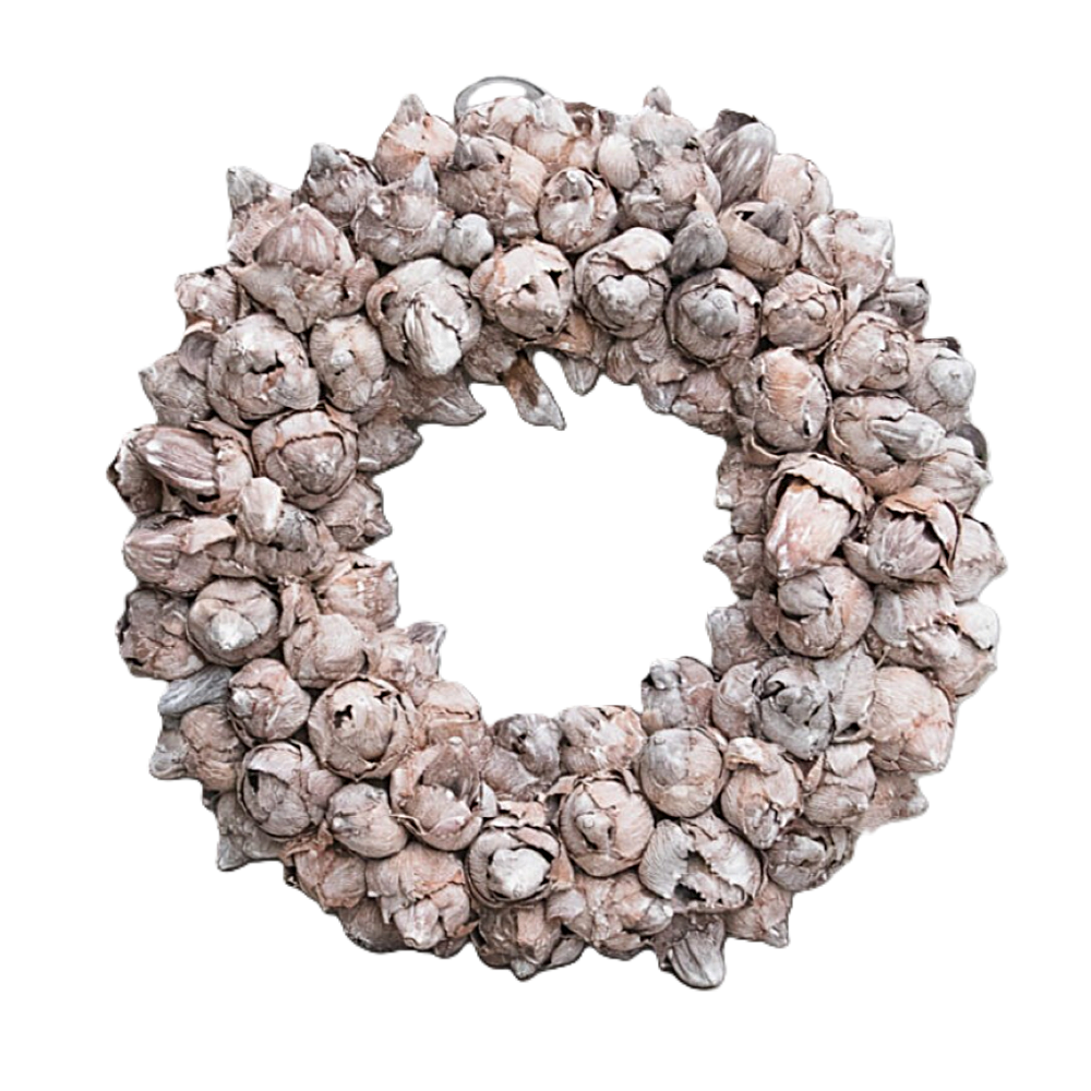 Dekorativer Kranz mit getrockneten Kokosfrüchten.